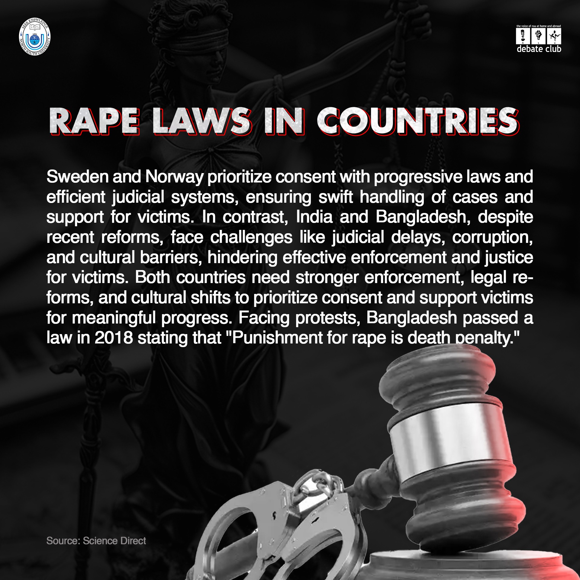 In stark contrast, the legal frameworks in India and Bangladesh are more traditional, albeit with recent amendments to strengthen the law. Following high-profile cases of sexual violence, both countries have introduced harsher penalties, including life imprisonment and the death penalty. However, these laws often focus on physical violence and coercion rather than the broader concept of consent, reflecting a more conservative approach to sexual crimes.
